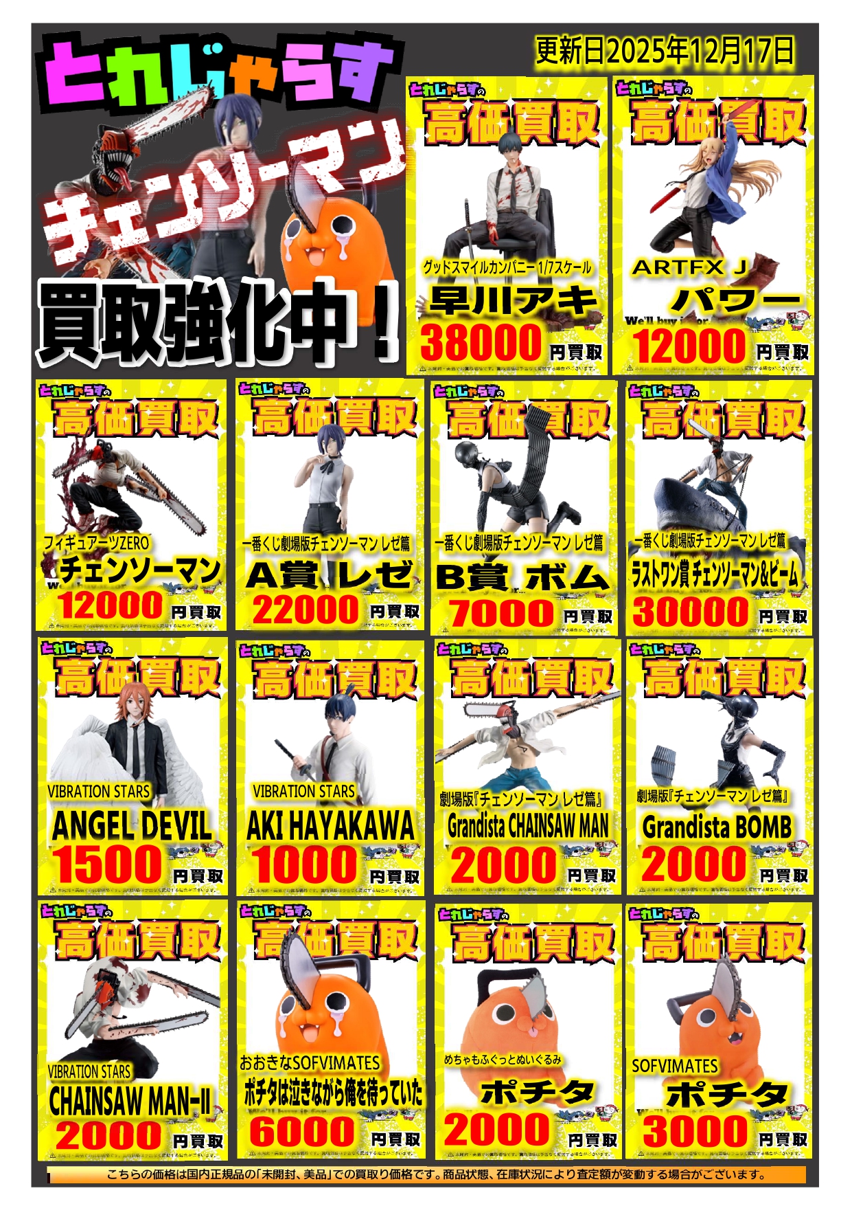 チェンソーマン関連フィギュア買取強化! 2025年12月18日 by webmaster メーカー品・一番くじなどチェンソーマンの人気商品を高価買取! もちろんミニフィギュア・グッズなども買取強化中! とれじゃらすオタロード店の店頭買取・宅配買取でお待ちしております。